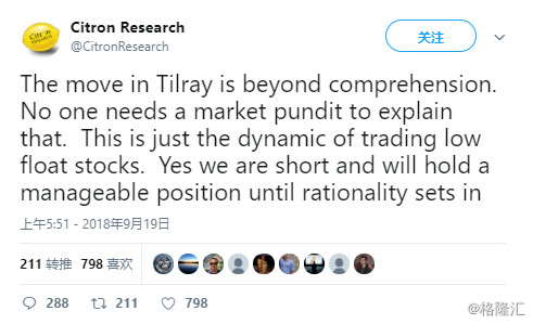 昨日晚间(9月19日)的疯狂,让香橼再次发帖,认为Tilray的举动无法理解,不需要市场来解释这一点。香橼坚定开始做空,Tilray应该恢复到理性的位置。