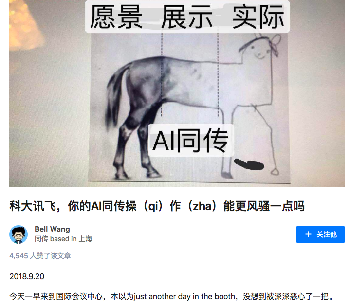 日前,有同声传译员在知乎爆料称,在近期举办的一场国际会议上,科大讯飞的AI同声传译其实是“复读”人工翻译的结果,而且“复读”并不准确,错误频出。这位网名为Bell Wang的网友表示:“所谓的智能翻译,就是按照文本读,而且是不管语义群分割的,文字显示也并不是语义群同时显示或锁定的,那就很显然是在识别语音,而不是根据原文在翻译。”