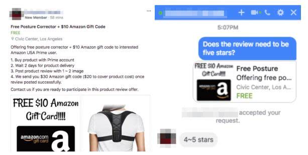 这些团体的帖子读起来就像有史以来最随意的大排档:草坪曝气鞋,除绒剂,尿布垫,性玩具……各类产品应有尽有,每分钟都会有新产品发布。大多数卖家都是中国人。2月份,小组成员还被告知说,中国农历假期可能会减缓付款。这些帖子还包括产品的图片,其中包含“审核后PP退款”的说明,这意味着评论成功后发评论者会收到PayPal付款。