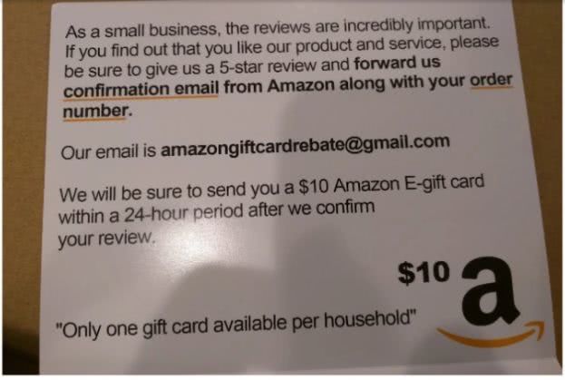 一位水军写好评后获得的10元购物卡,图片来源:fakespot.com