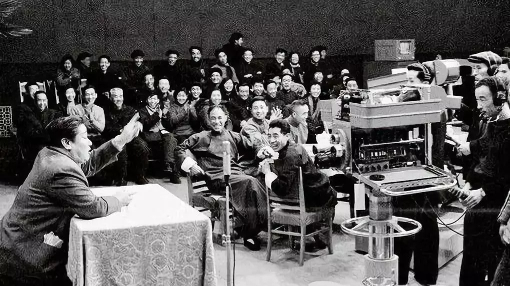 1962年1月20日,在北京电视台举办的第二次“笑的晚会”上,北京人民艺术剧院演员方琯德(左一)在开场白中说道:“其实我不是喜剧演员,我是一个悲剧小生“。图/新华社。