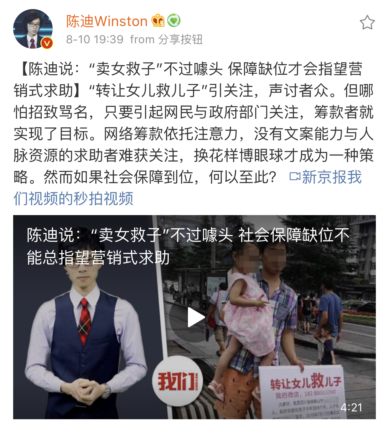 还记得一个多月前那条“卖女救子”的新闻吗?一位父亲在街头打出“转让女儿救患病儿子”的广告,在微博上引来巨量的批评。我很喜欢的媒体人陈迪当时写下了这样的评论: