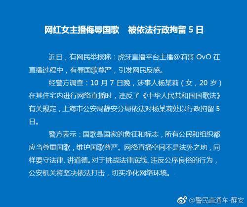 @警民直通车-静安【虎牙女主播侮辱国歌,被依法行政拘留5日】据@警民直通车-静安 10月13日晚通报,近日,有网民举报称:虎牙直播平台主播@莉哥OvO 在直播过程中,有辱国歌尊严,引发网民反感。经查:10月7日晚,涉事人杨某莉(女,20岁)在其住宅内直播时,违反了《中华人民共和国国歌法》有关规定,上海市公安局静安分局依法对杨某莉处以行政拘留5日。