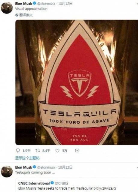 @TechWeb【马斯克又搞事情:申请特斯拉牌龙舌兰商标Teslaquilla】10月14日消息,据国外媒体报道,特斯拉CEO马斯克正在申请特斯拉牌龙舌兰商标Teslaquilla(Tesla+tequilla)。