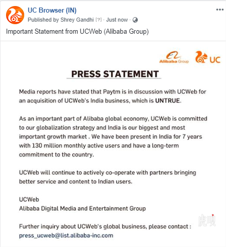 @IT之家【UCWeb印度回应收购传闻:消息不实】印度媒体 Times of India 称 印度电子商务公司Paytm正计划以4至5亿美元收购UC阿里巴巴旗下移动浏览器UCWeb的印度市场业务。对此,阿里巴巴和UC回应称:“UC并没有和 Paytm 就收购问题进行过任何接触。”此外,UC全球化发展方向非常坚定,不会考虑将UC印度业务出售。