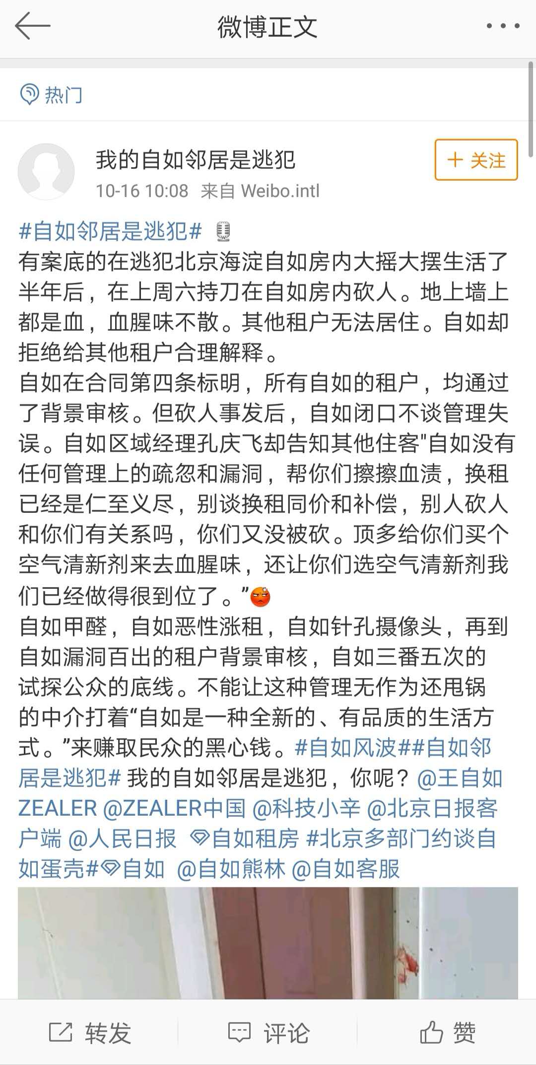 “一位有案底的在逃犯在北京海淀自如房内大摇大摆生活了半年后,在上周六持刀在自如房内砍人。事发后,租住房内血迹斑斑,而自如并未给其他用户合理解释。”