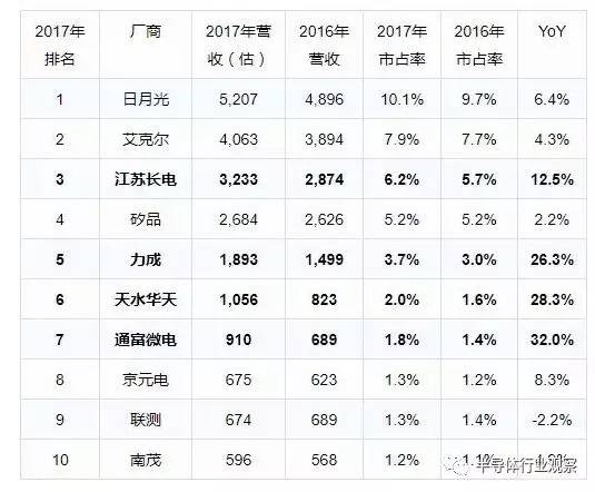 根据拓墣产业研究院的数据,2017全球前10大专业IC封测厂商的排名与2016年相比几无差异(如表所示),而中国大陆有三家厂商跃进了前十的位置。