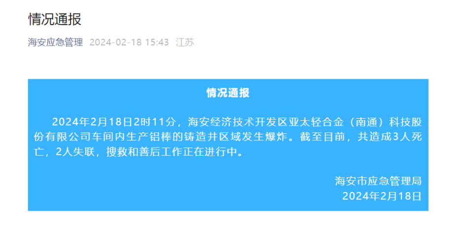 据海安市应急管理局官微消息,2024年2月18日2时11分,海安经济技术开发区亚太轻合金(南通)科技股份有限公司(以下简称“亚通科技”)车间内生产铝棒的铸造井区域发生爆炸。截至目前,共造成3人死亡,2人失联,搜救和善后工作正在进行中。