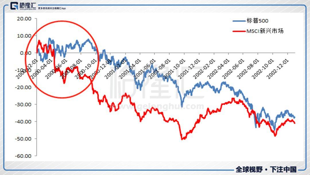 10月份开始,美股与新兴市场开始同方向扑街,到2001年9月,新兴市场见底,跌去了50%,美股跌超30%。之后美股与新兴市场有一波反弹,新兴市场反弹更多。