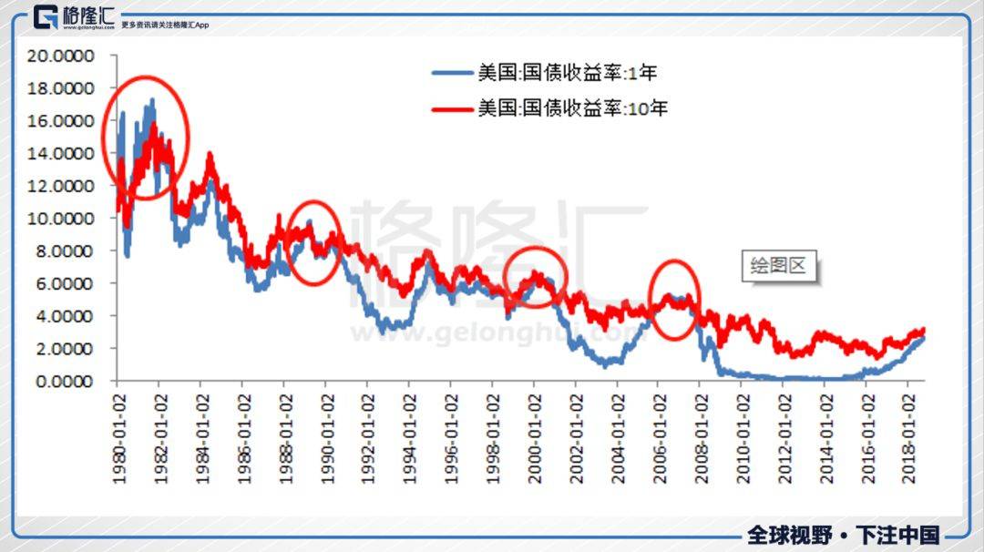 看过去的历史,可以看出,每次它们出现倒挂,都发生在经济拐点的时候,比如1980年到1981年,1989年到1990年, 2000年,还有2007年,倒挂后面都跟着经济萎缩。目前还没有倒挂,但利差在缩小。另外,1987年10月股市崩盘时,经济仍然处于强劲的增长中,那一次并没有利差倒挂出现。
