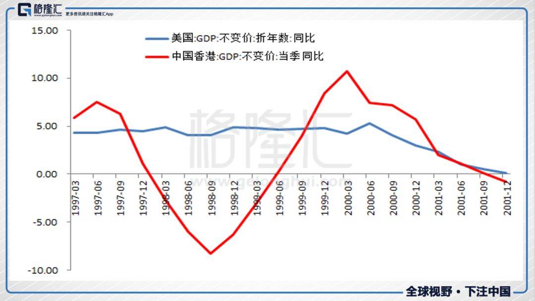 看美国90年代的经济增速,你几乎看不出1997年到1998年的亚洲金融危机。我们看香港,1997年四季度增速从上季度的6.3%下降到1.1%,接下来连续5个季度GDP萎缩,1998年三季度GDP同比萎缩了8.3%。
