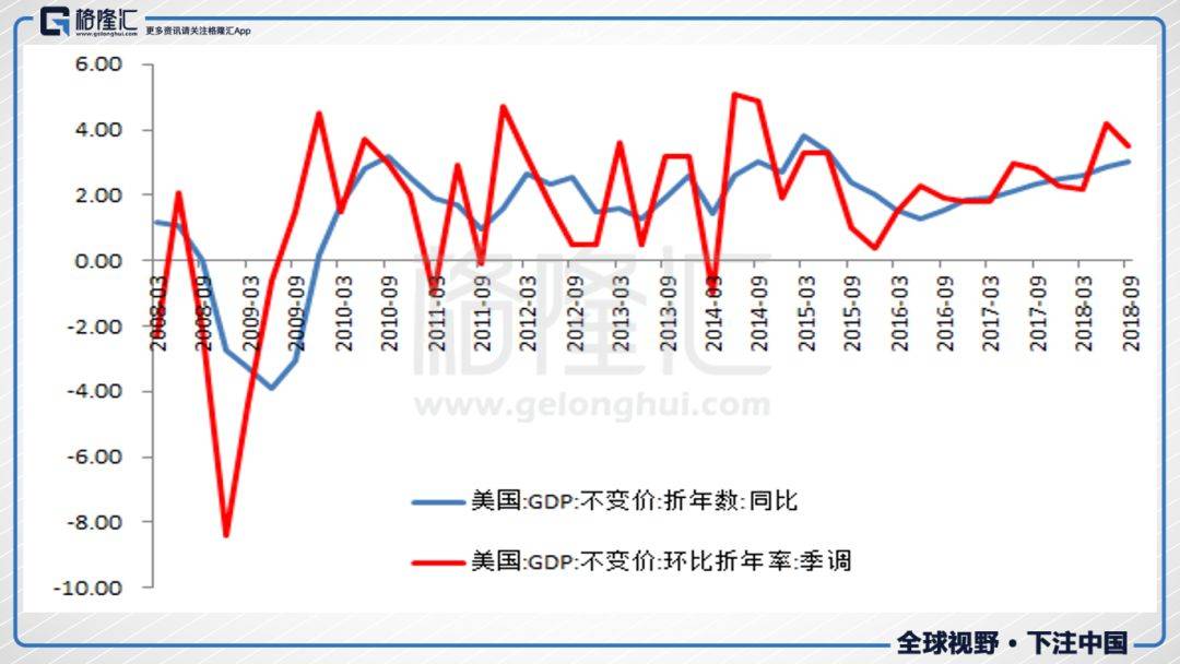 我们知道,美国二季度的经济强劲,二季度GDP同比增长2.87%,是2015年三季度以来的最快增速,环比增长4.2%,是2014年四季度以来的最快增速。刚刚公布的三季度GDP数据也是非常好的,GDP同比增长3.04%,环比增长3.5%,好于预期。