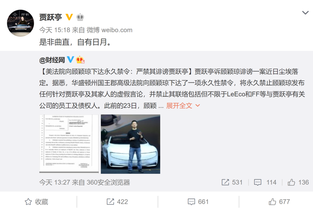 对此,贾跃亭今日发布微博回应称,“是非曲直,自有日月。”