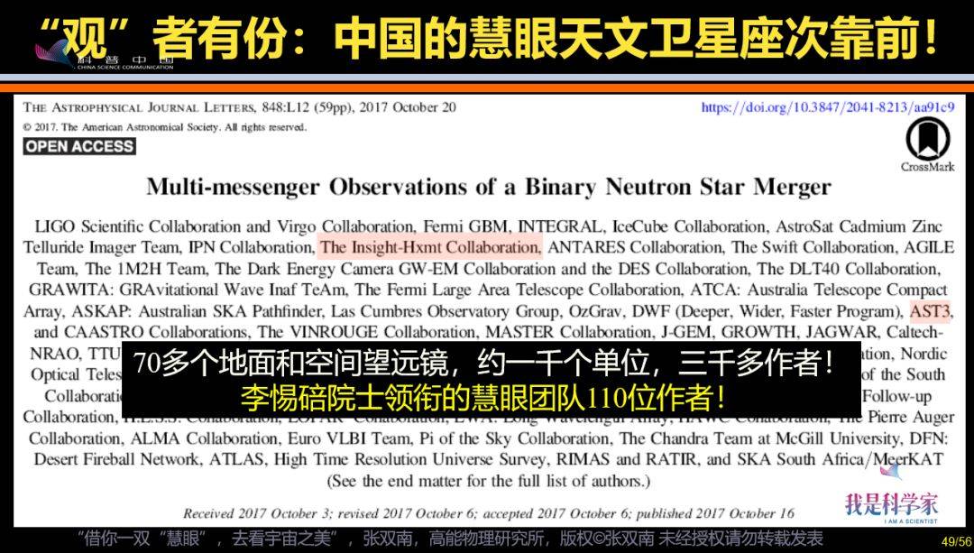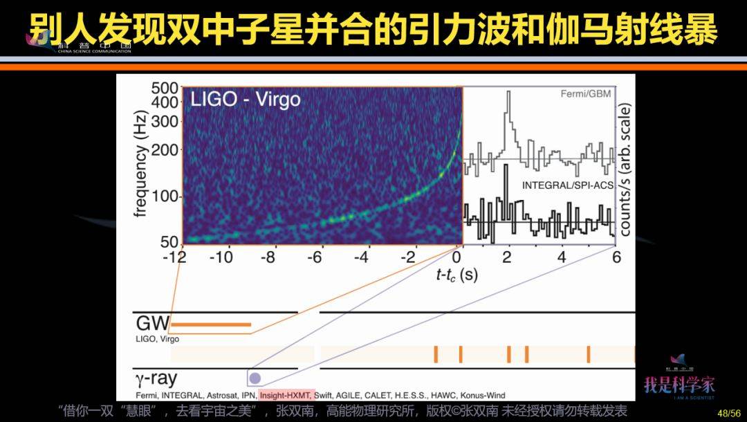 这上面的图给大家看的左边是引力波的信号,右边是别人的仪器探测到的伽马射线的信号。我们这个仪器的名字,大家看底下Insight-HXMT(“慧眼”卫星的英文名字)也在上面。我们虽然对这张图上的数据没有贡献,但是对于它的限制给出了贡献。