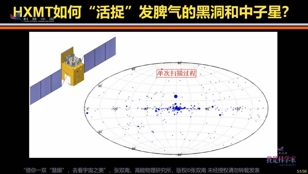 比如说黑洞附近有一个恒星,恒星是一个非常热的气体球,它的气体会在黑洞强烈的引力吸引下往黑洞跑,跑到黑洞附近产生X线和伽马射线。我们看银河系里面有很多黑洞和中子星经常都在干这个事情。平时看不到它,突然变得活动,我们就是要活捉它们,研究这些黑洞什么时候活动,怎么活动,怎么发脾气的,对于理解黑洞的性质甚至于检验广义相对论理论都非常有帮助,“慧眼”卫星就是做这个工作的。我们用卫星对整个银河系进行扫描,扫描的过程中如果这些黑洞和中子星发火了,我们就能看到。