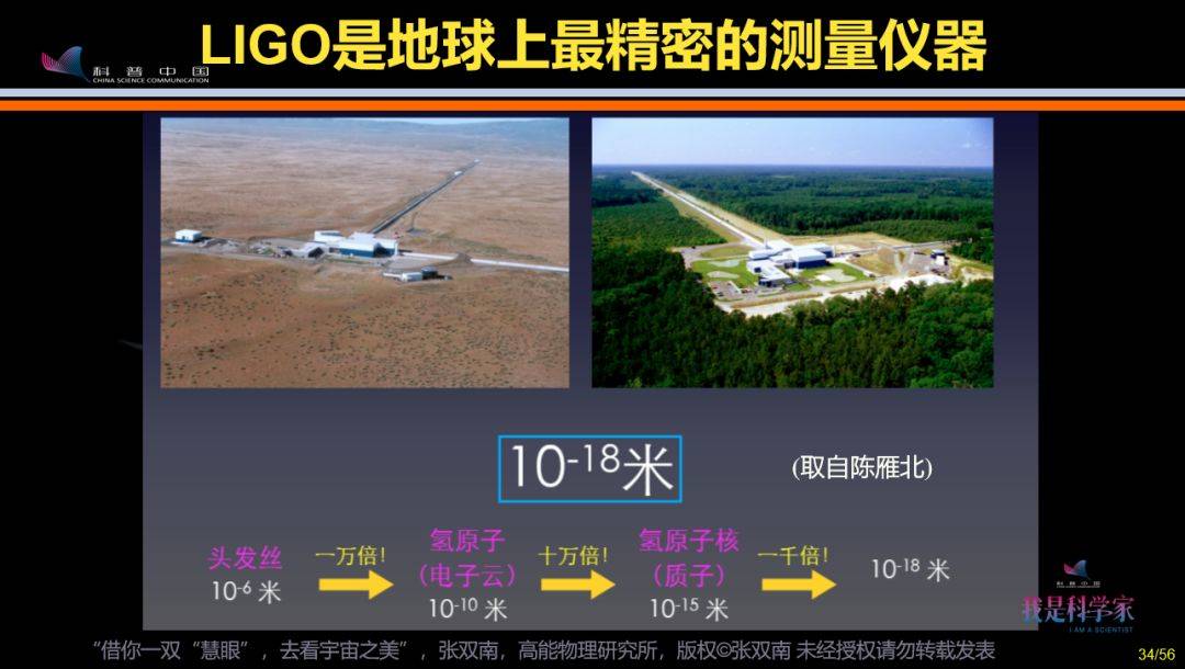 我刚才给大家讲引力波到达时LIGO的两个管道一个变长一个变短,到底变了多少?变了10^(-18)米。我们头发丝是10^(-6)米,比头发丝小1万倍是原子的大小,比原子再小10万倍是原子核的大小,比原子核再小1000倍,才是10^(-18)米。他们要的是10^(-18)米,要探测的是比原子核还小1000倍的这么点距离的变化。