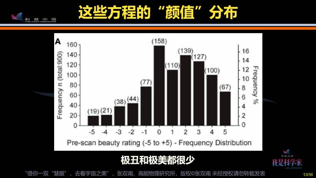 这张图是数学家们眼中公式的“颜值”分布。中间的部分是比较平庸的,不美也不丑;最左边的和最右边分别是最丑和最美的。他们首先得到一个结论:极美和极丑的数学方程很少。