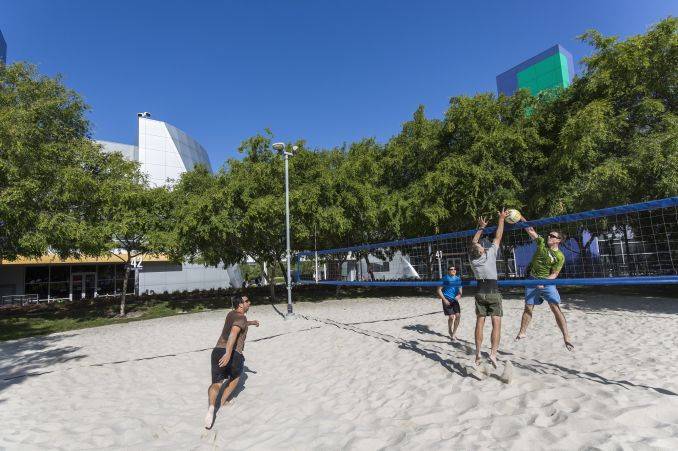 谷歌位于加利福尼亚州山景城的公司总部占地12英亩。为方便员工在公司总部内部通行,谷歌向员工免费提供色彩鲜艳的“G自行车”。谷歌公司总部还设有有机花园、网球场、运动场和沙滩排球场。
