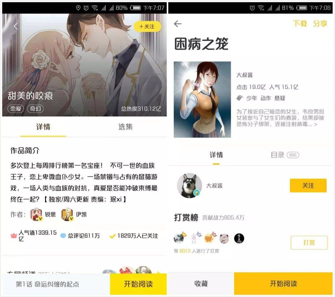 平台方面,2017年12月,快看漫画完成了规模1.77亿美元的D轮融资,是目前漫画领域规模最大的一笔融资。作为目前漫画市场占有率第一的公司,这个价格相比于网文第一的阅文集团近500亿的市值,仍有较大距离。
