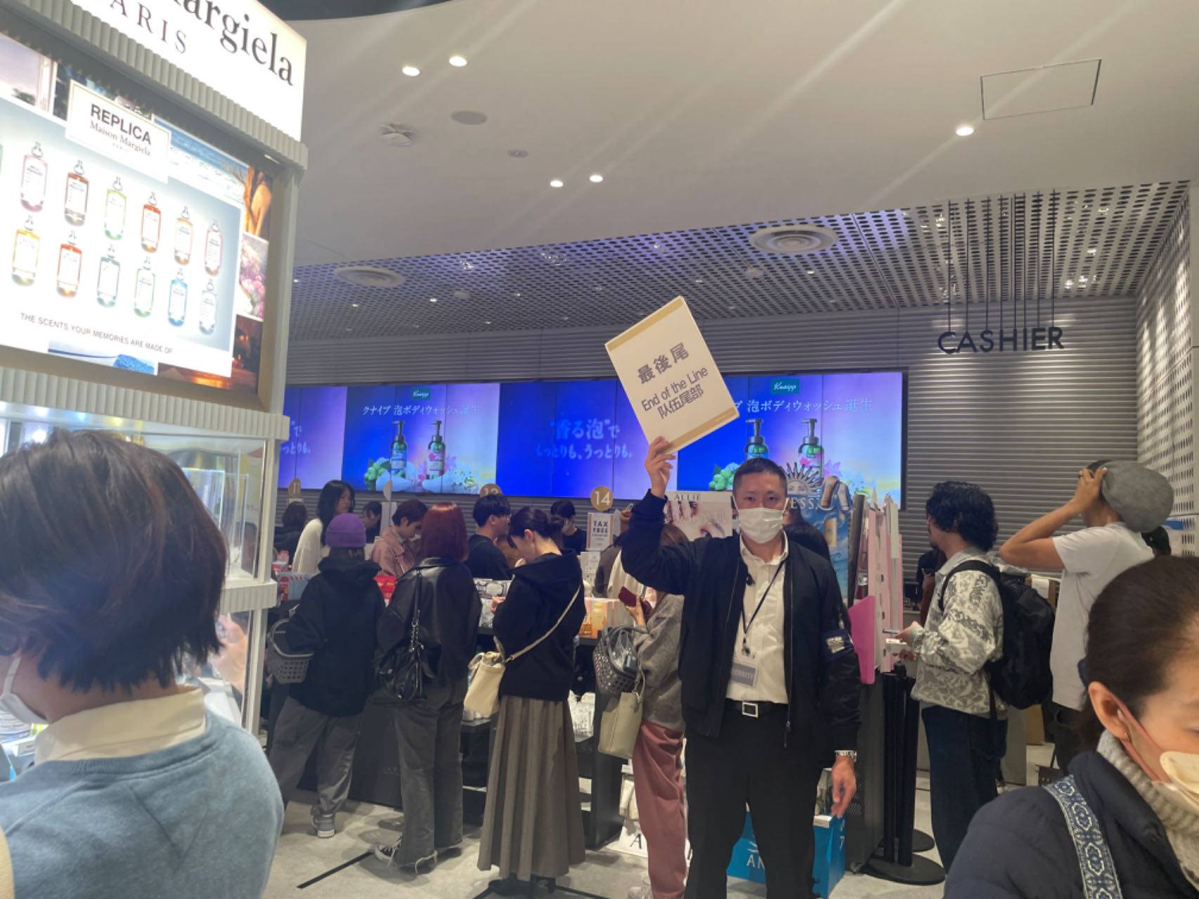 而聚焦在原宿地铁站口,视线躲不开的是一座三层的美妆集合商场@Cosme,店内涵盖了欧美、日韩、泰国等各个价位的美妆品牌多达近千种,尽管各大品牌仅有一个小导柜的位置,但丝毫不影响店内的火热,排队结账的人一直保持在两圈以上,工作人员不得不举着“这是队尾”的牌子做提示。