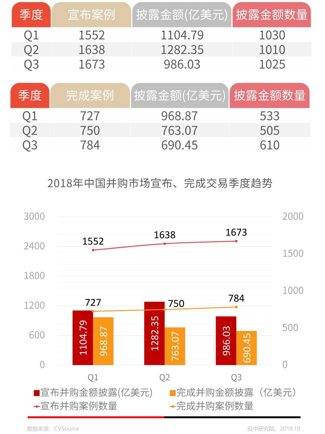 从整体趋势来看,第三季度宣布交易和完成交易数量基本保持稳定,但交易金额规模有一定比例的下降。