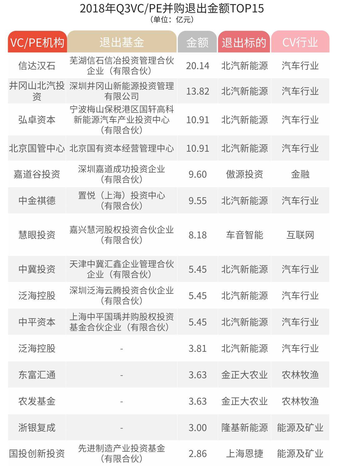 Q3共计64家VC/PE机构参与完成并购交易,投资金额约为66.33亿美元,约有54家VC/PE成功退出,回笼金额约24.5亿美元。其中退出金额最大的交易是信达汉石退出北汽新能源,金额规模达到20.14亿美元。