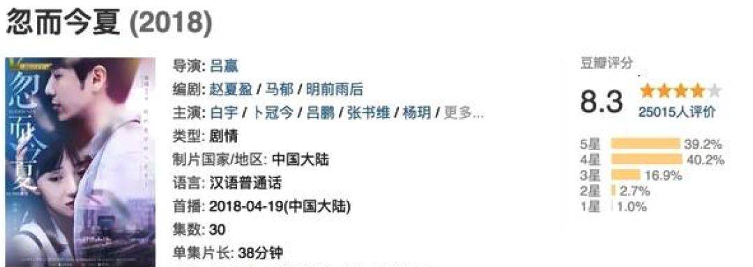 与此同时,很多青春作品都选择用狗血桥段来表达青春的残酷,但很多用户觉得不真实,他们更愿意在小事件、小情感、小人物里去寻找真实的感动。像今年的豆瓣高分作品《忽而今夏》,就是一个案例。