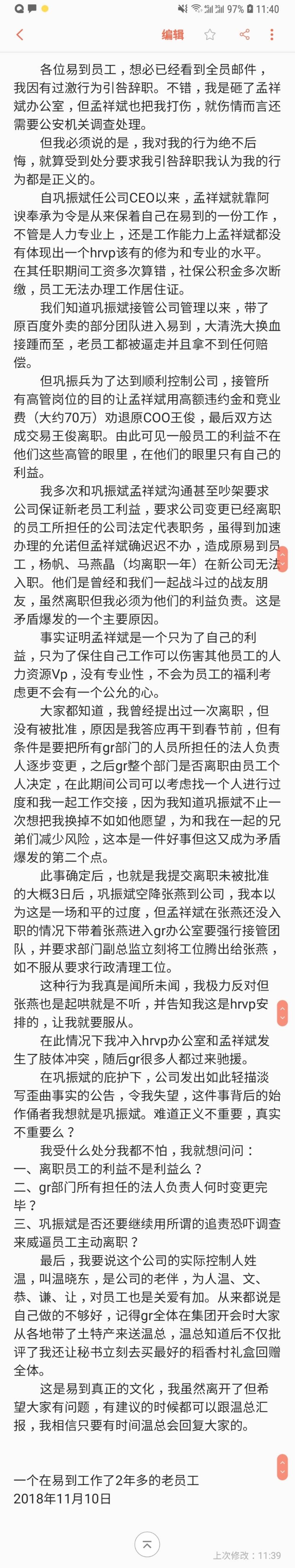 处在漩涡中的易到,今天发布官方声明称:网传“CEO欺凌员工”言论不实,随后将向公众还原事件真相。而在36氪的报道中,一位易到内部核心人士却表示,事情本身并非像吕艺说的那样。