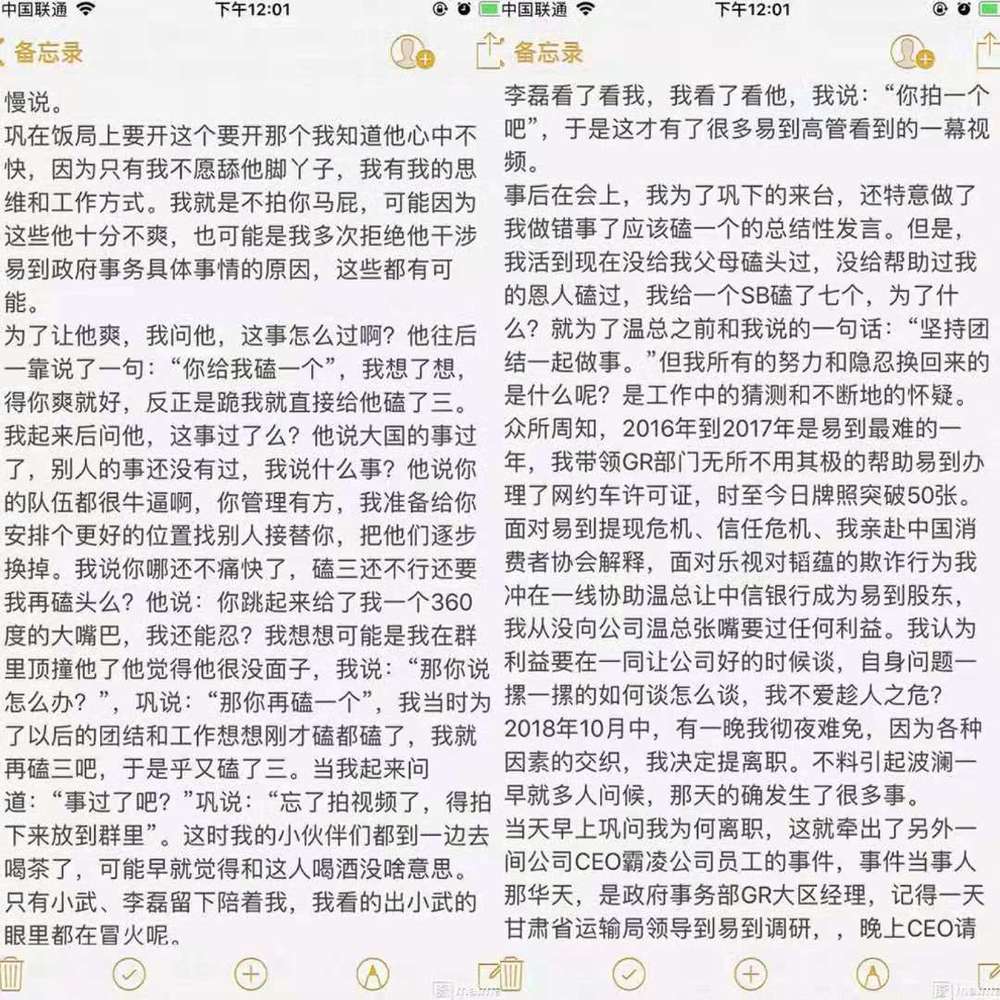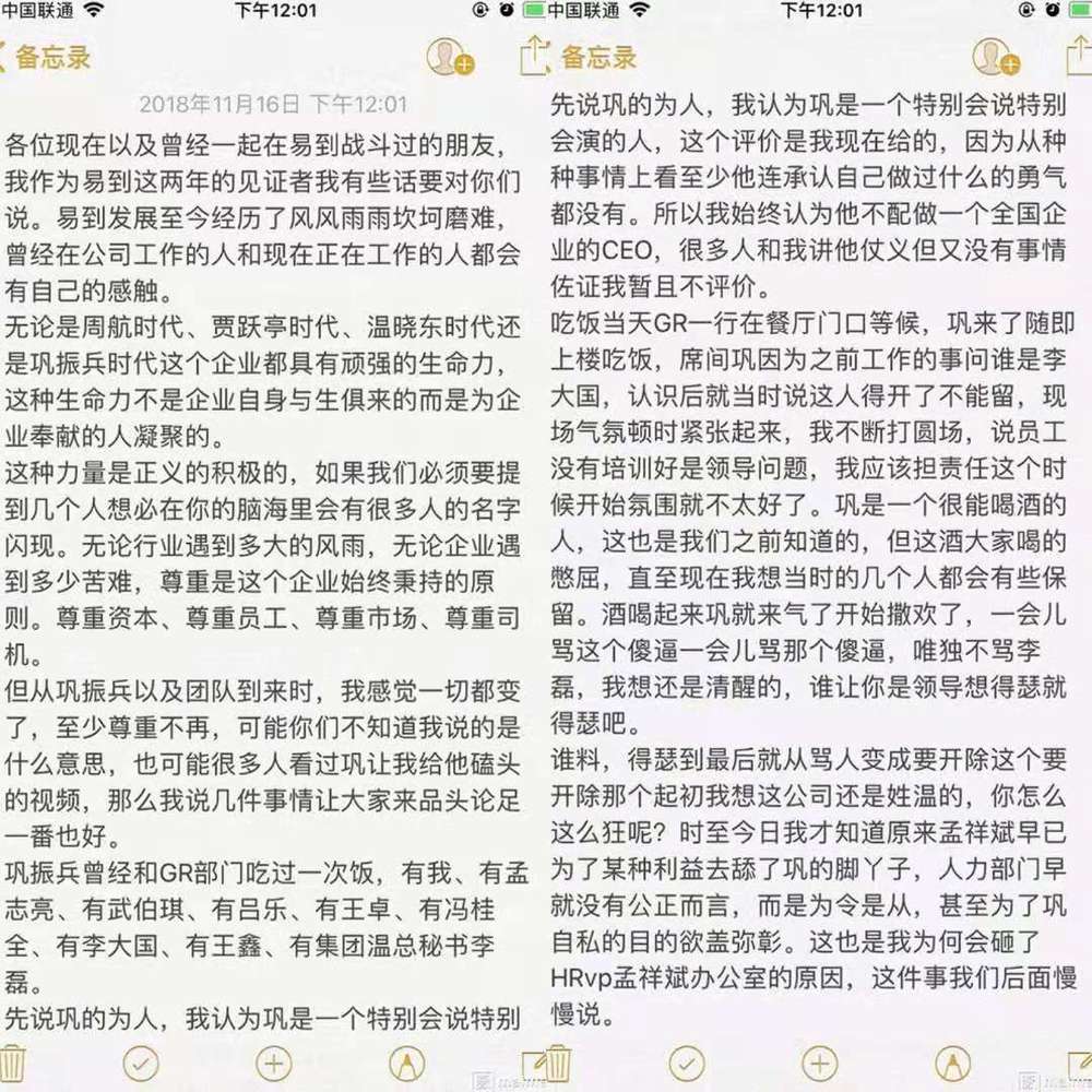 这名内部人士的版本是:吕艺为易到GR部门负责人,因为之前和巩振兵有些工作上的矛盾,所以几个月前,GR部门的员工请巩振兵吃饭喝酒,“相当于吃了这顿饭,大家一笑泯恩仇”。当晚巩振兵被灌醉,“吕艺说要磕头拜大哥,以后就是好兄弟了,因为巩振兵喝多了瘫在那里,神志也不是很清醒,所以就也没有阻止”。