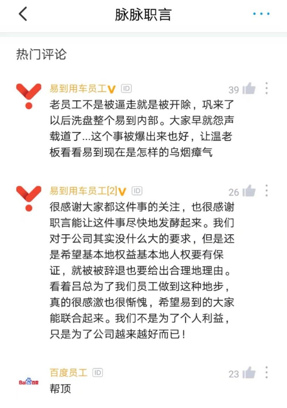 还有其他的易到用车员工也有着类似的评论:老员工不是被逼走就是被开除。