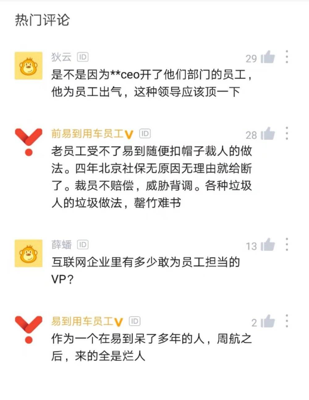 还有认证为“现易到用车员工”吐槽道,自己在易到待了多年,“周航(时代)之后,来的全是XX。”(真实情况有待验证)