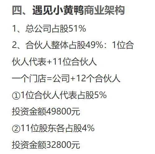上述“遇见小黄鸭加盟官网”的网站还详细介绍了具体的门店投资结构:每家门店由遇见小黄鸭总公司占股51%,12位合伙人整体占股49%。该12位合伙人中,1位合伙人代表投资金额为4.98万元,持股5%,另外11位合伙人需各投资3.28万元,分别持股4%。