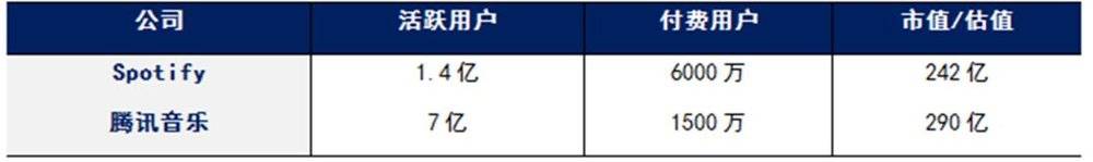 以腾讯音乐为例,今年3月瑞典流媒体音乐服务商Spotify(SPOT. NYSE)在美国上市,其IPO文件显示,Spotify持有大约9%的腾讯音乐股份,价值9.1亿欧元,根据股份计算,腾讯音乐的整体估值为101.1亿欧元左右(约合123亿美元)。
