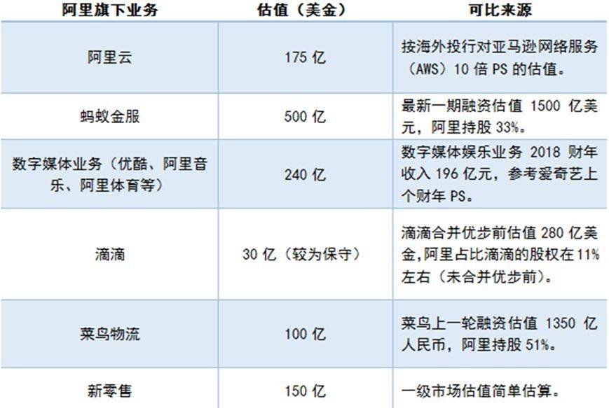 2018财年(阿里财年并非自然年)总体GMV为4.8万亿,市场预测2019财年GMV将达到6万亿,此时预计P/GMV=0.43(汇率按6.8计算)。