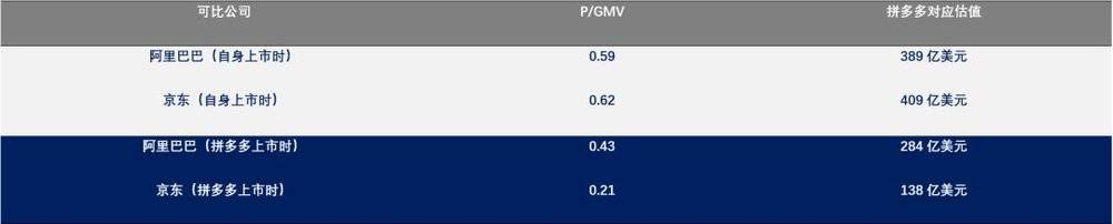 2018年7月26日拼多多在美上市,由于拼多多还处于GMV核心驱动的初期亏损阶段(PE法不适用,PS法估值无法体现初期的高速增长优势),且并非社交平台(社交平台多用ARPU值法估值),所以用P/GMV的相对估值法较为合适。