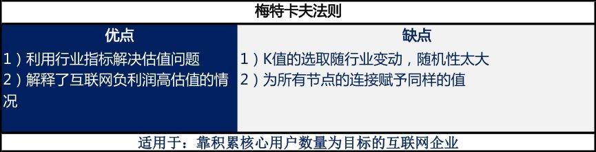 这一阶段较为主观的定性(商业模式、变现模式、未来技术发展前景)估值居多,对于互联网平台类、消费类这种依赖于核心用户数的企业则适用于改良后梅特卡夫法则。