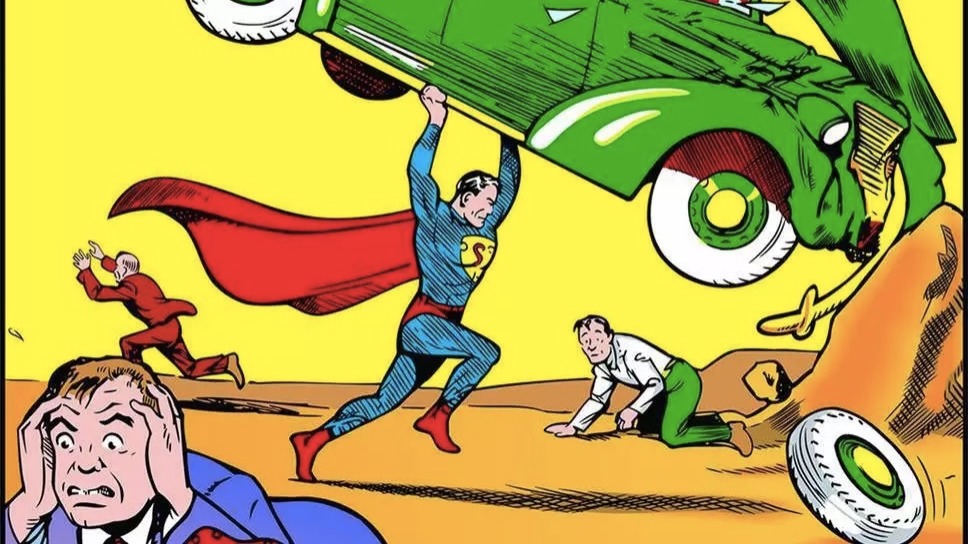 不停地试错之后,1938 年 4 月 18 日,13 页的超人故事在新刊《动作漫画》上和读者见面了。那期漫画封面上,超人手举一辆轿车,要把它砸向坏人,坏人几乎被吓尿了,抱头乱窜。