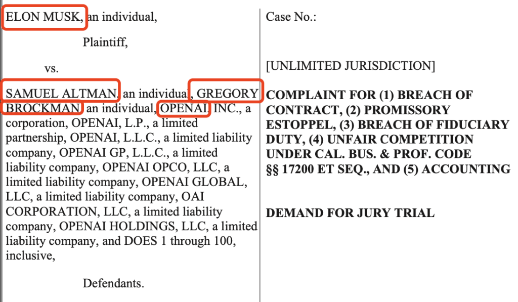 马斯克向旧金山高等法院提起诉讼,以违反合同为由,状告OpenAI CEO萨姆·阿尔特曼(Sam Altman),OpenAI联合创始人、总裁格雷格·布罗克曼(Greg Brockman)以及OpenAI多个实体。不过被告名单没有出现疑似已经离开OpenAl的OpenAI联合创始人兼首席科学家伊尔亚·苏茨克维(Ilya Sutskever)。
