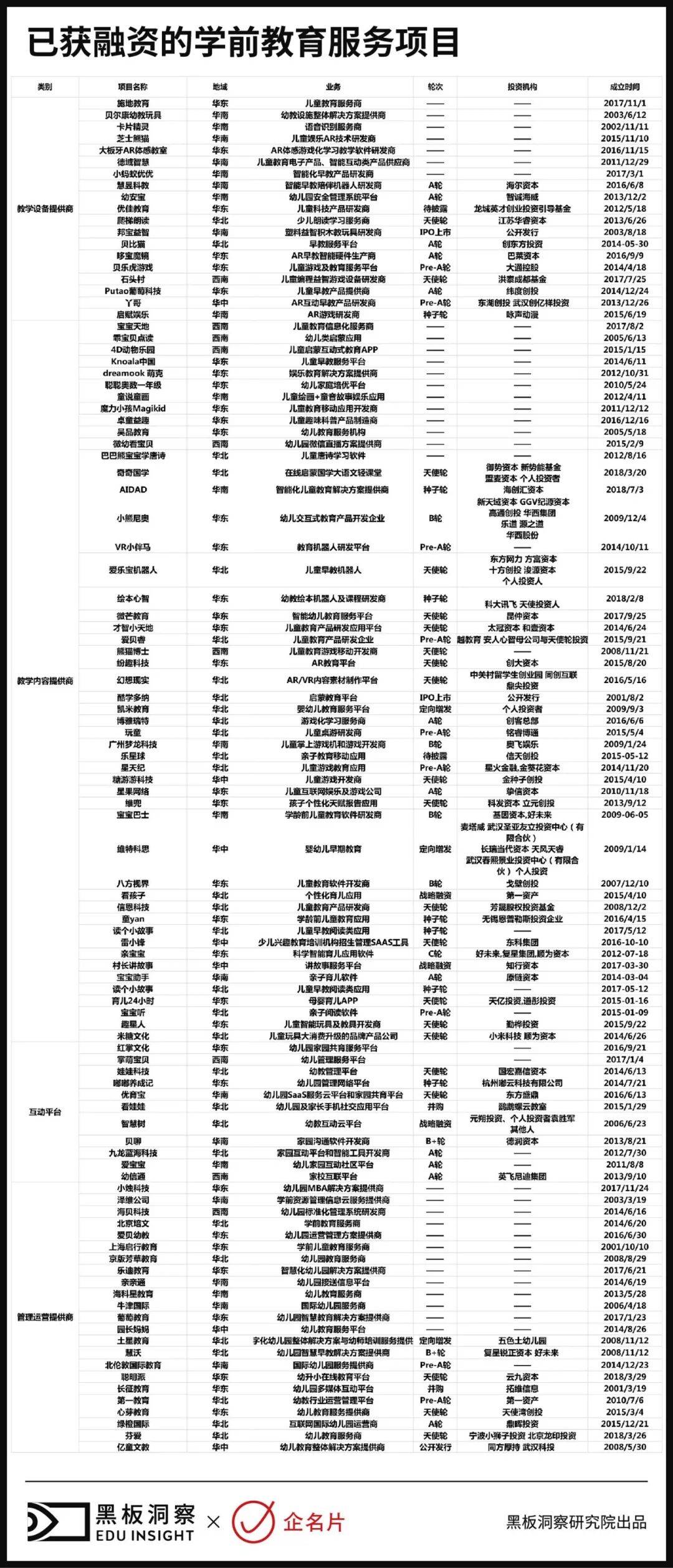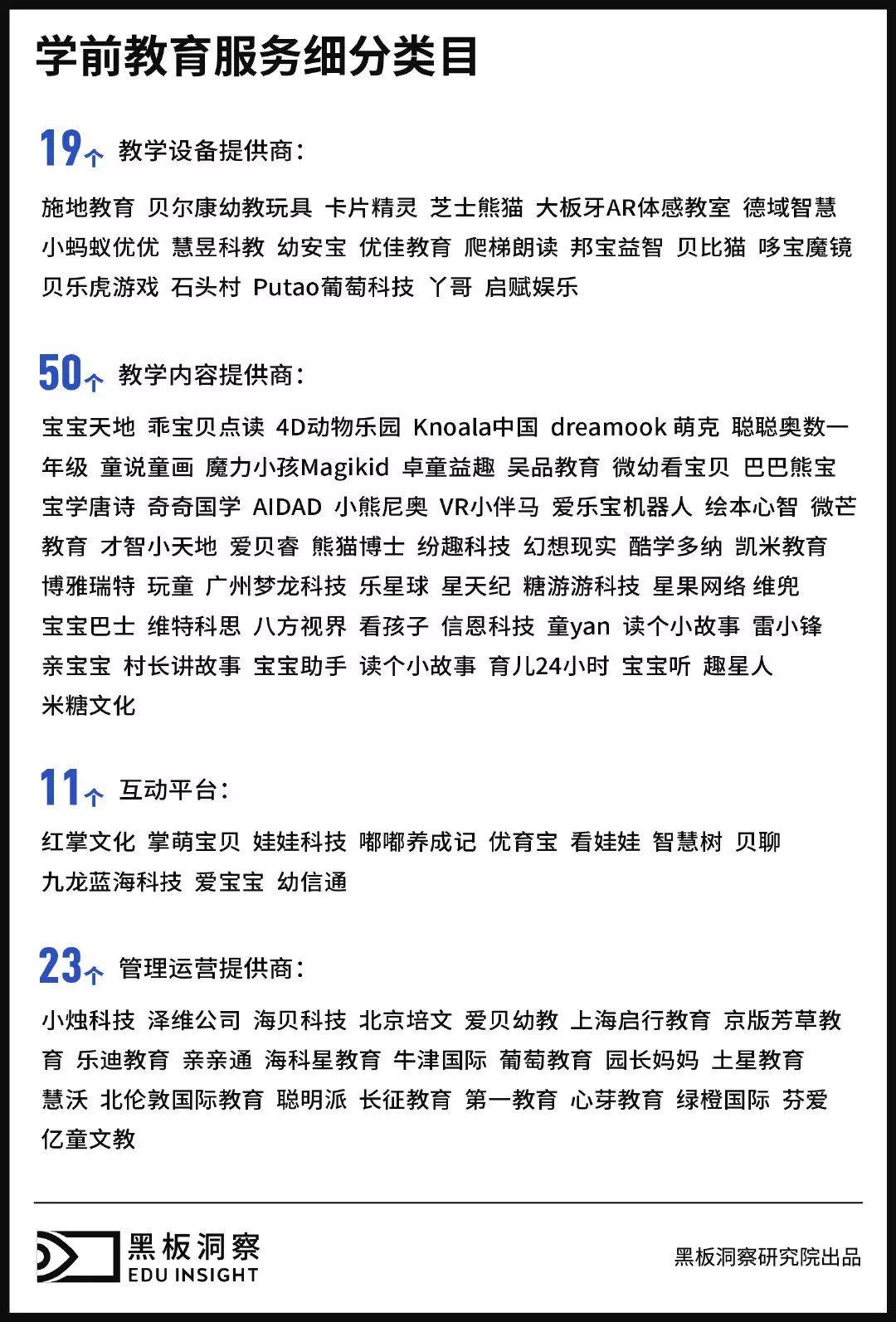 按照学前教育服务公司提供服务的类型,黑板洞察将其分为四个大类:教学设备提供商、教学内容提供商、家校管理运营提供商和平台构建商。
