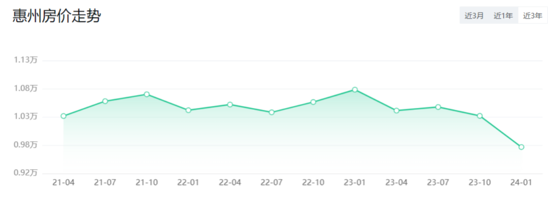 据安居客惠州,截至2024年1月,惠州二手房均价为9776元/平方米,这个价格已经低于3年前。