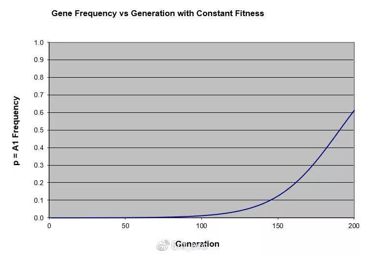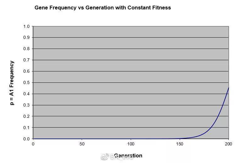 我算了一下,如果这个基因提供难以想象的高达12%的惊天大优势的话,5000年之后它的频率能上升到0.45。而且在前3000年里,一般人也根本注意不到它;直到第3350年的时候,它的频率才刚刚突破千分之一大关。