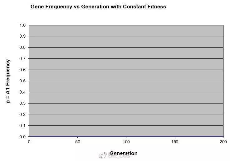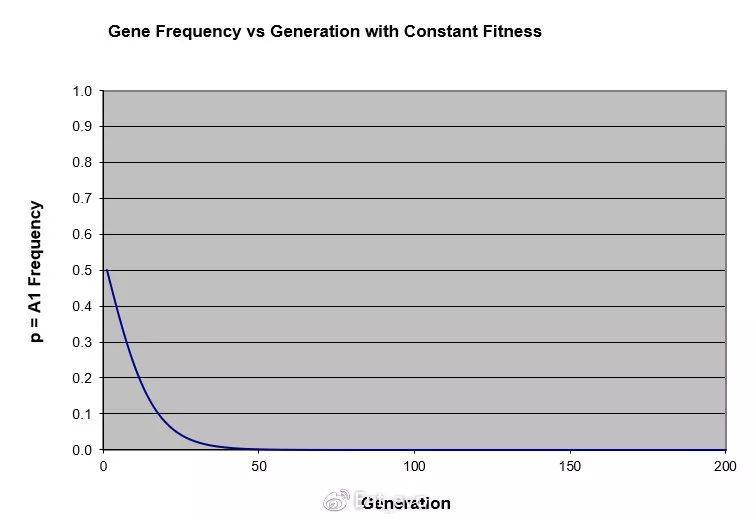 那么它的频率就会持续下降。如果一个坏基因一开始占据了人群中的50%,而它会带来2%的劣势,那么5000年之后,它的频率会降低到2%。