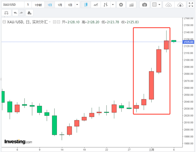 截至3月5日,金价已连续五个交易日上涨,涨幅超过100美元。