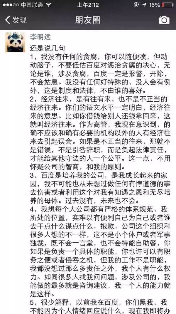 与卫哲的低调离开不同,李明远在当天凌晨的朋友圈发了近千字长文,面对贪腐传闻。他强调自己没有任何贪腐,否则百度为何不报警?