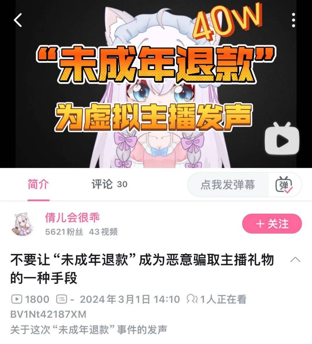 她的粉丝量虽然有将近 15 万,但作为一个顶着二次元皮套做美食内容,小众到不能再小众的虚拟 UP 主,也被退钱哥宰了一刀。