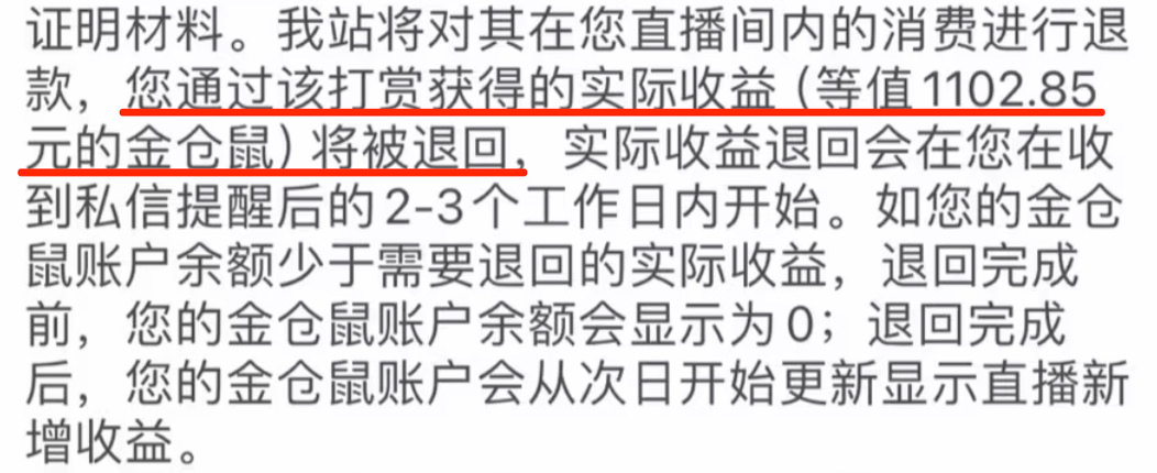 未成年退款的时候,要求主播退的,并非是税后的金额,而是直接从金仓鼠账户里,扣除主播税前所得的金额。