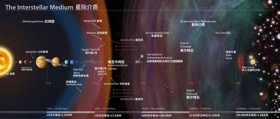 现在,旅行者1号和旅行者2号飞出了日球层,也就是说,它飞出了太阳风吹出的那个气泡的边界。但这个边界距离太阳也就不到20光时,比起太阳引力的疆域要小得多了。所以,没错,旅行者2号飞进了星际介质,但这并不等同于它飞出太阳系了——这完完全全是两个不一样的概念。