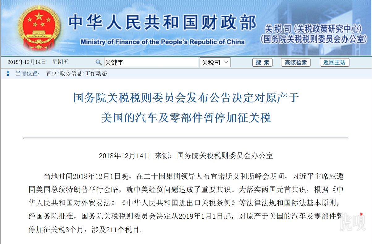 今天,国务院关税税则委员会发布了关于对原产于美国的汽车及零部件暂停加征关税的公告,中国决定对原产美国汽车及零部件暂停加征关税3个月: