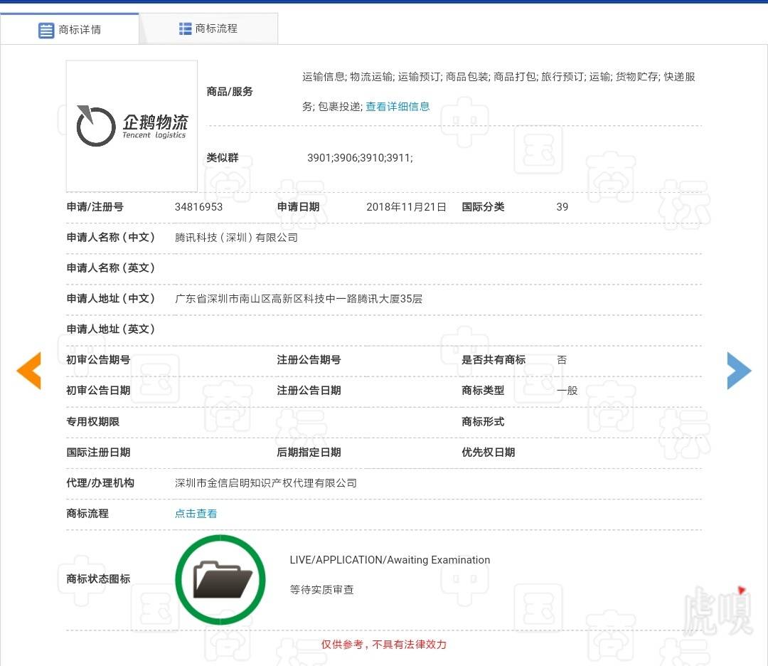 据商标局信息显示,企鹅物流涉及的业务包括:运输信息、物流运输、运输预订、商品包装、商品打包、旅行预订、运输、货物贮存、快递服务、包裹投递等。而腾讯方面则对新浪科技回应称,“这是个做公司内的物流,与业务没关系”。