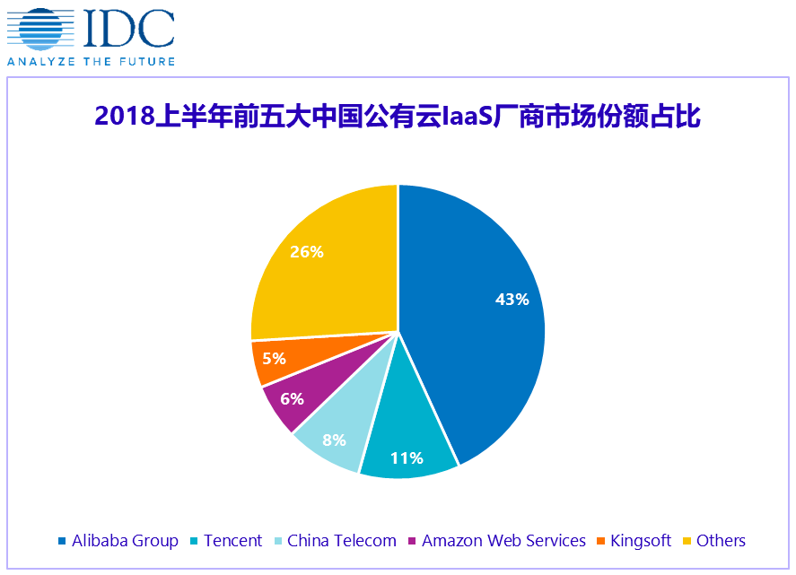 据IDC 12月13日发布的最新《中国公有云服务市场半年度跟踪报告》,2018上半年中国公有云服务整体市场规模(IaaS/PaaS/SaaS)超30亿美金,其中IaaS市场增速再创新高,同比增长83%。其中,阿里云业务在中国云计算IaaS市场上占据了43%的份额,腾讯则占据11%,百度在公有云领域仍属新晋厂商,无法“拥有姓名”。